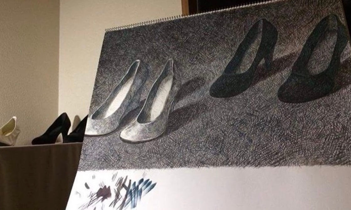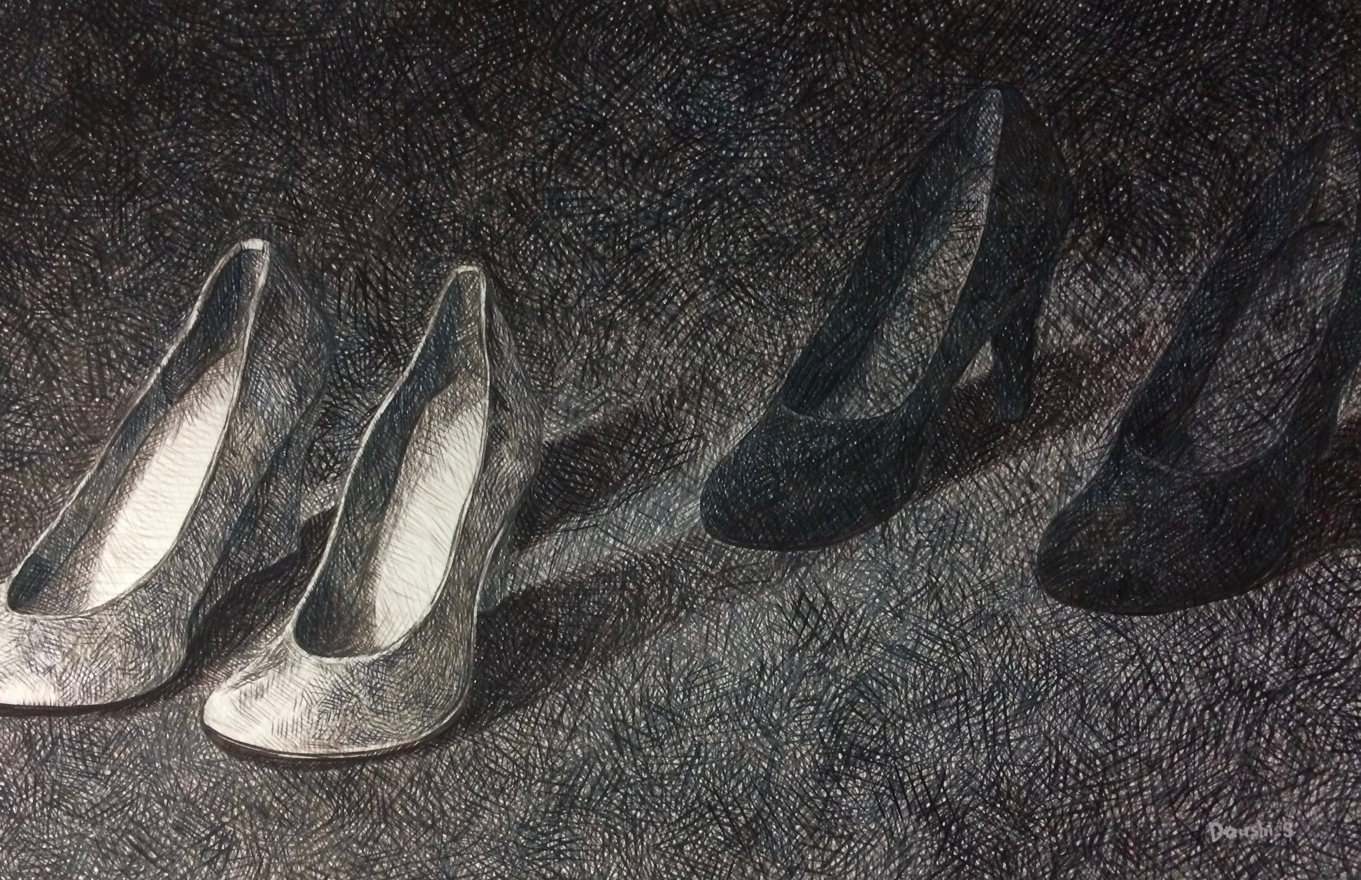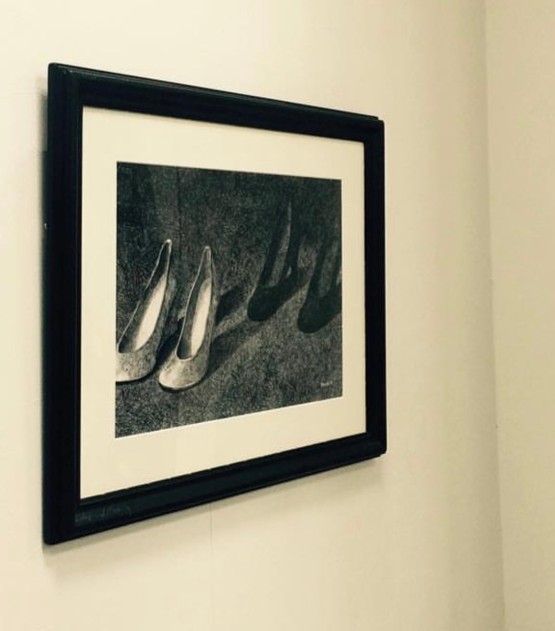 この作品は絵筆一本でアクリル絵の具を使ってデッサンするようにシャープな線で丁寧に仕上げています。