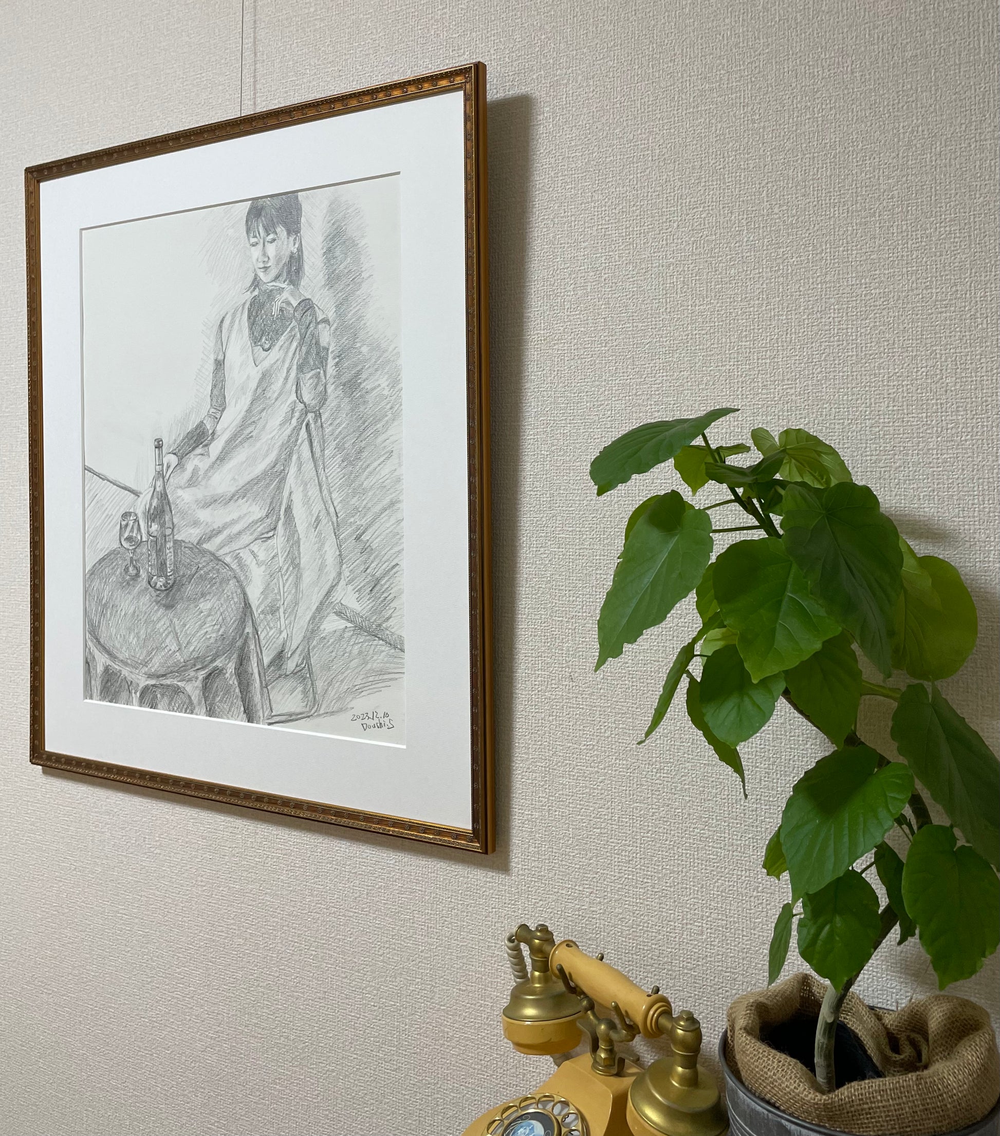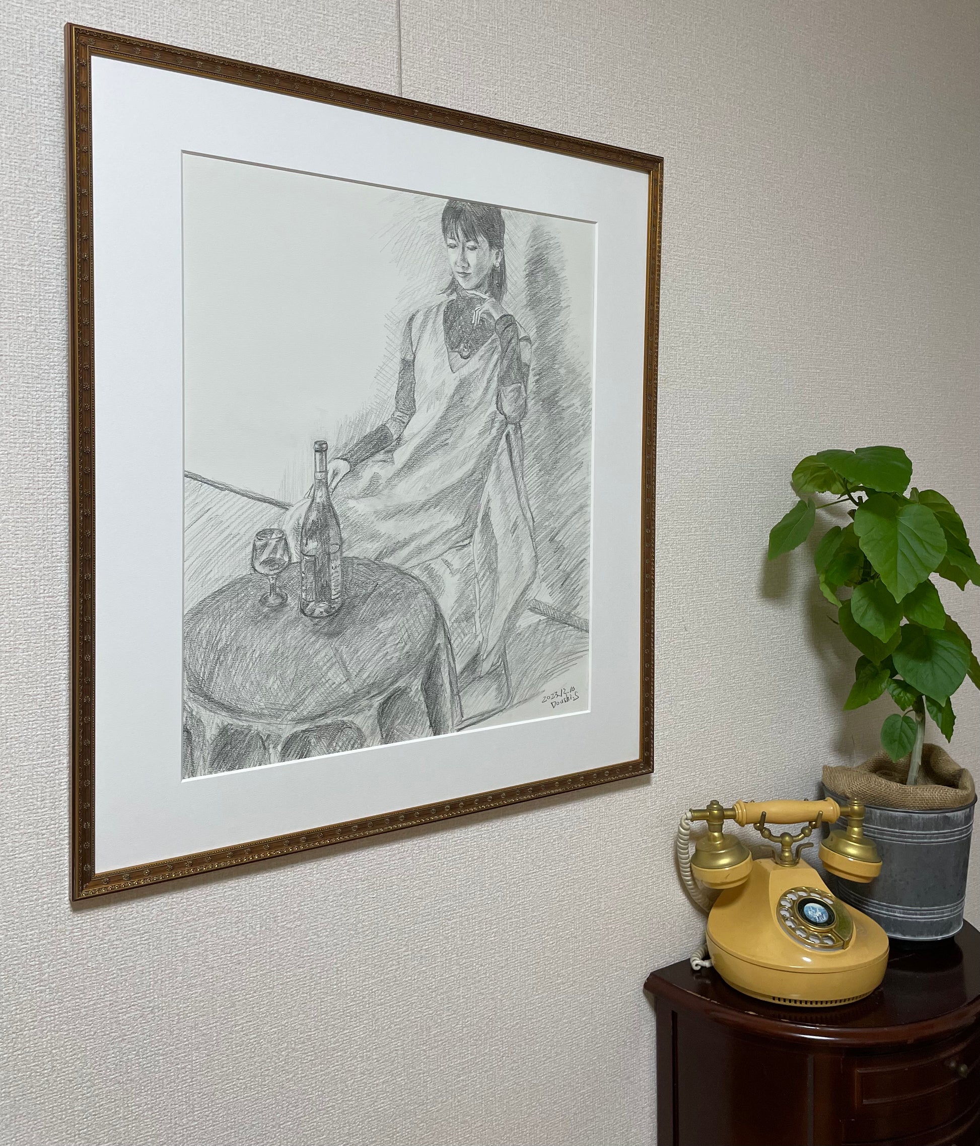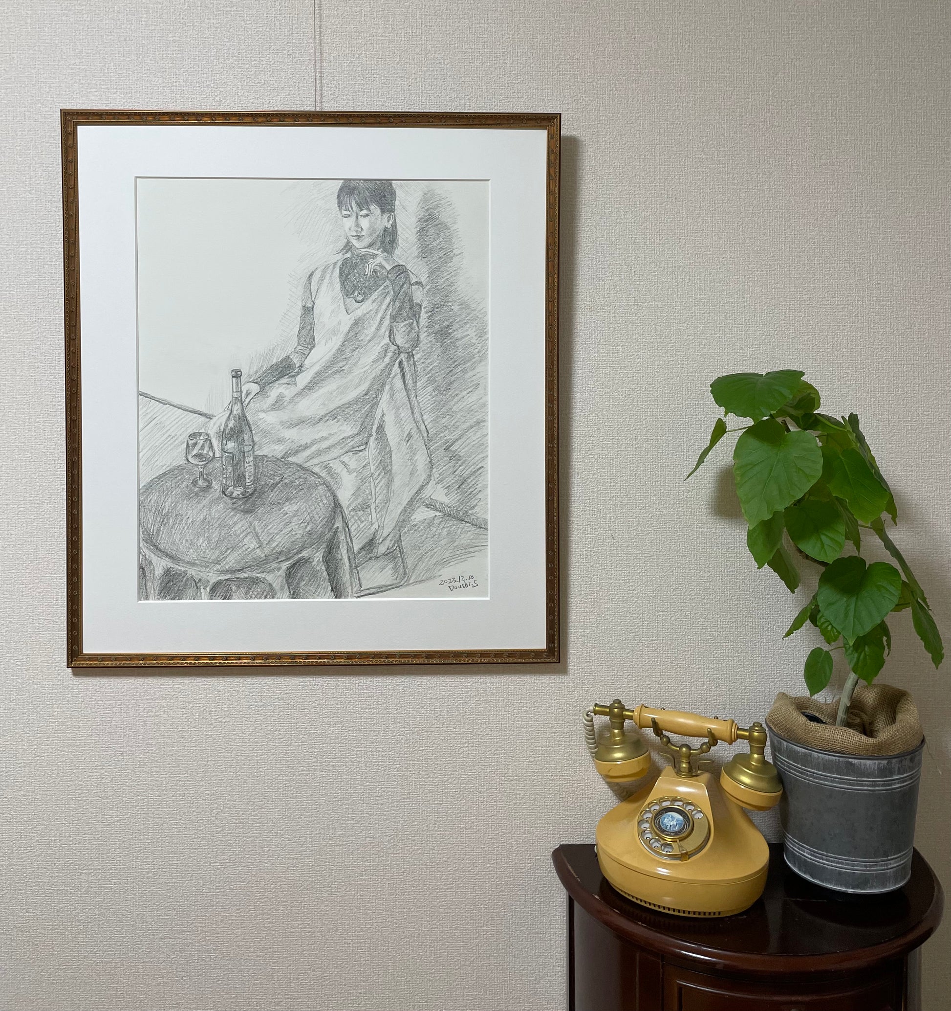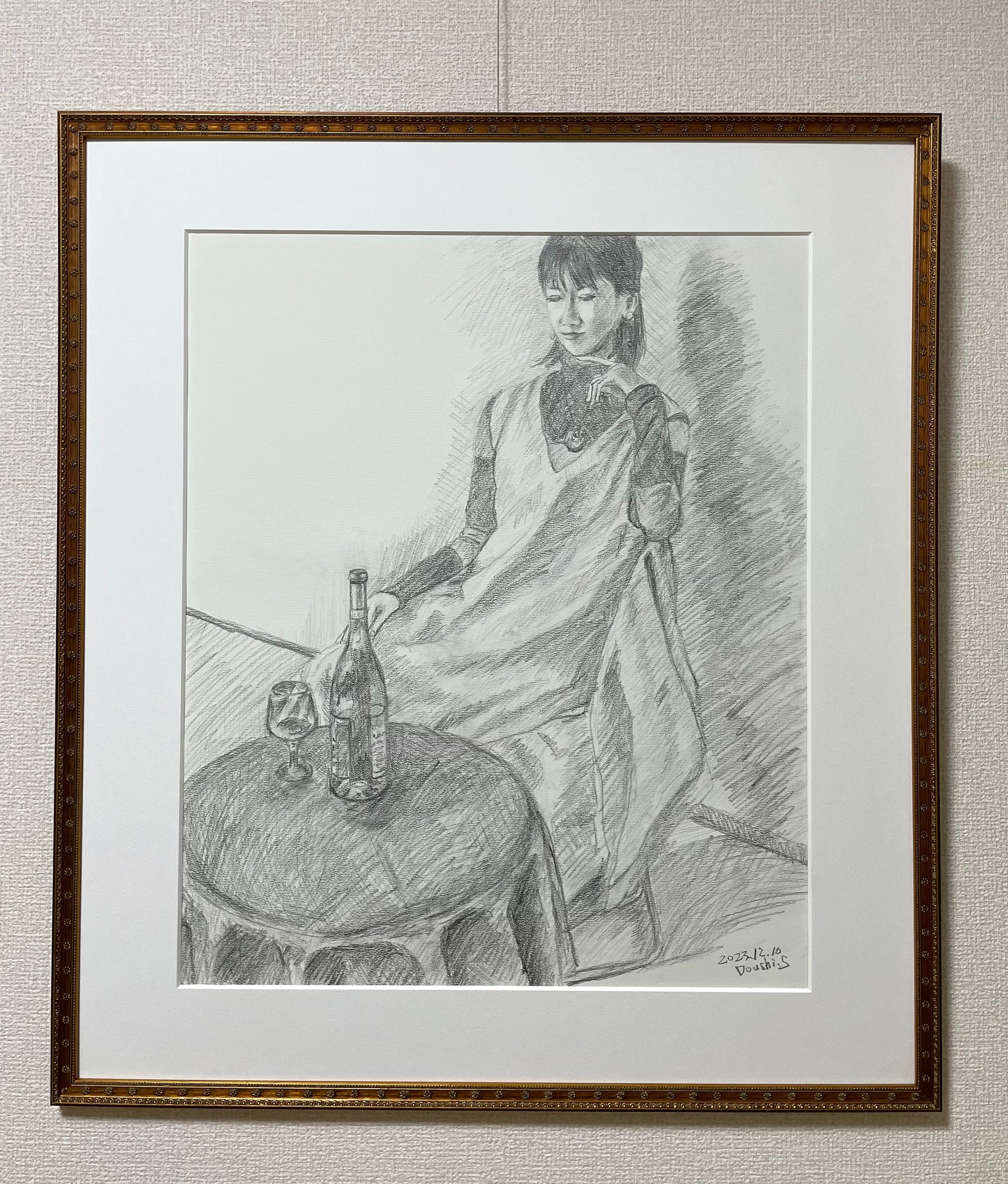 モデルにポーズをお願いし、ワインとグラスを丸いテーブルに置いて実際に見て描きました。